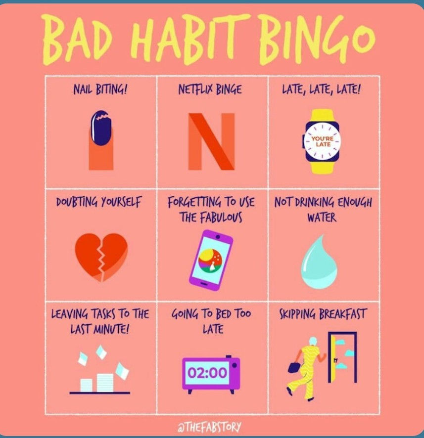I got this graphic from the Fabulous app this morning. If you don't know, the Fabulous app is a app meant for life improvement and gives you all sorts of daily challenges for yourself. I have been using it for a morning challenge since April. And it gives you daily graphics like this one: BAD HABIT BINGO. I really wanted to share this because I am working through some of these things myself. Maybe not the nail biting, but some of these things I am still dealing with and working through. How about you? Dealing with any of these bad habits? Sound off in the comments and don't be shy. Feel free to participate!